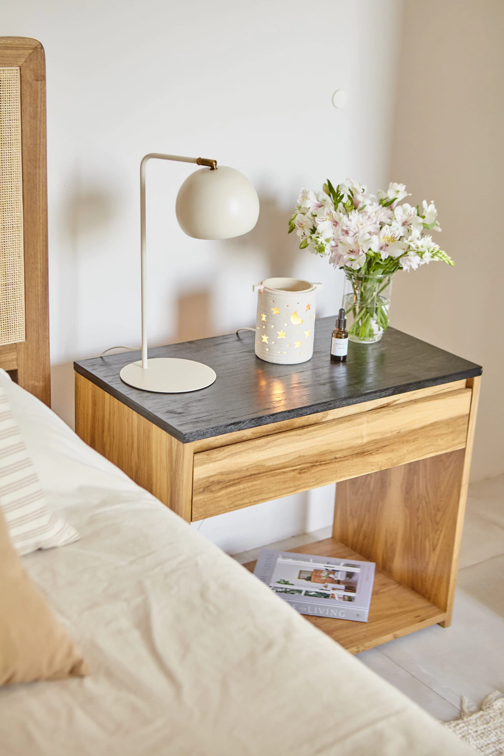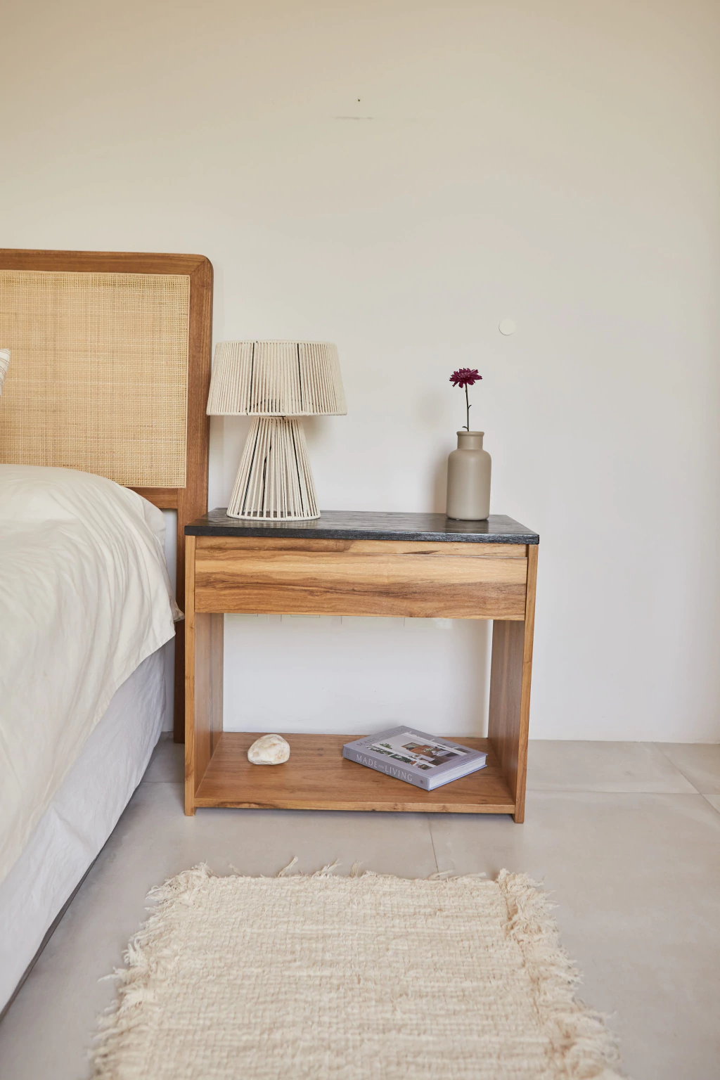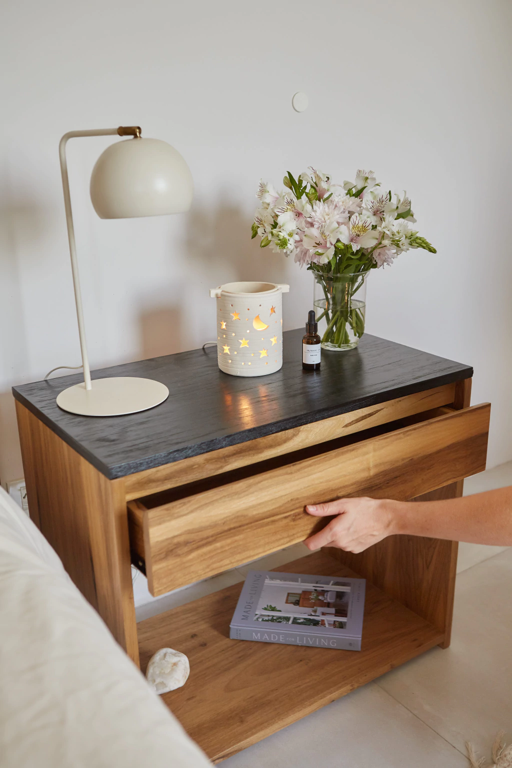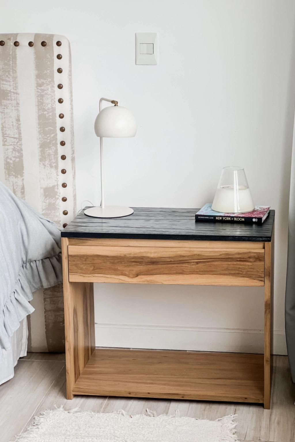 Mesa de luz en madera Petiribi con tapa arenada y laqueada en negro. Cajon con correderas telescópicas.