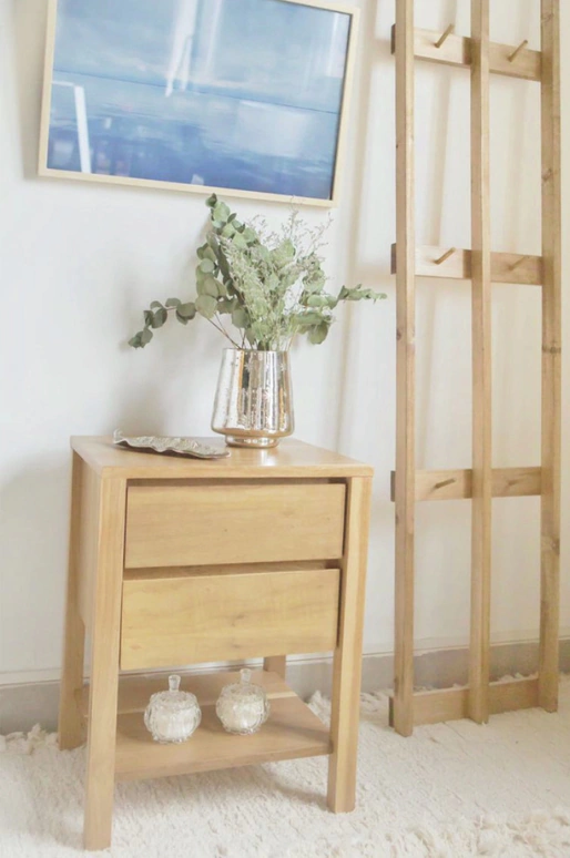 Mesa de luz petiribi con estante y dos cajones con guias telescopicas.