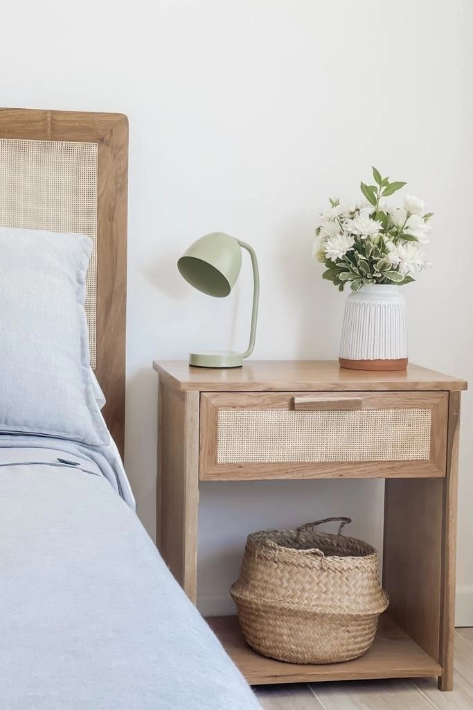 Mesa de luz en petiribi, con tapa enchapada en petiribi y su cajon con esterilla.