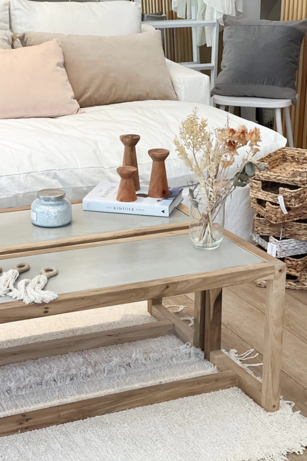 Mesa con estructura maciza en Petiribi y tapa de microcemento. El color de la tapa es a elección entre gris claro, intermedio u oscuro.