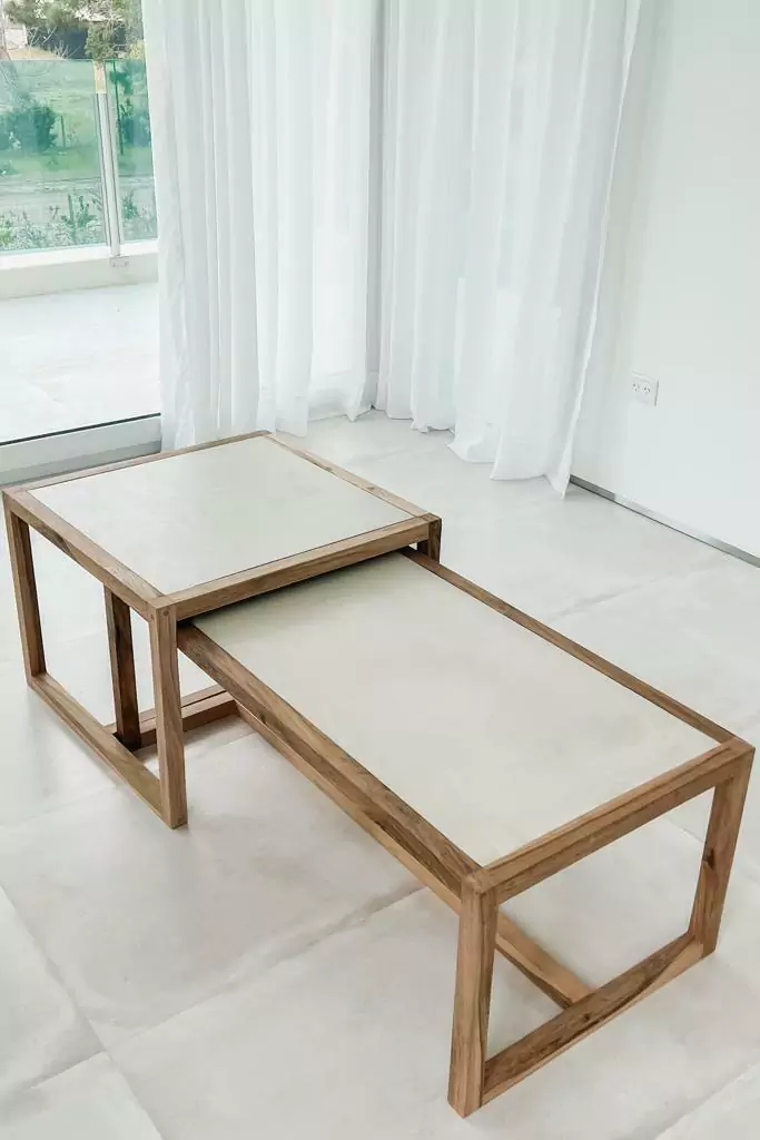 Mesa con estructura maciza en Petiribi y tapa de microcemento. El color de la tapa es a elección entre gris claro, intermedio u oscuro.